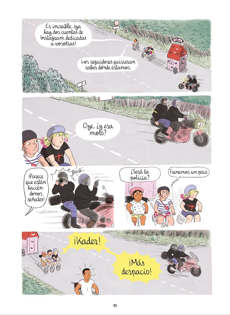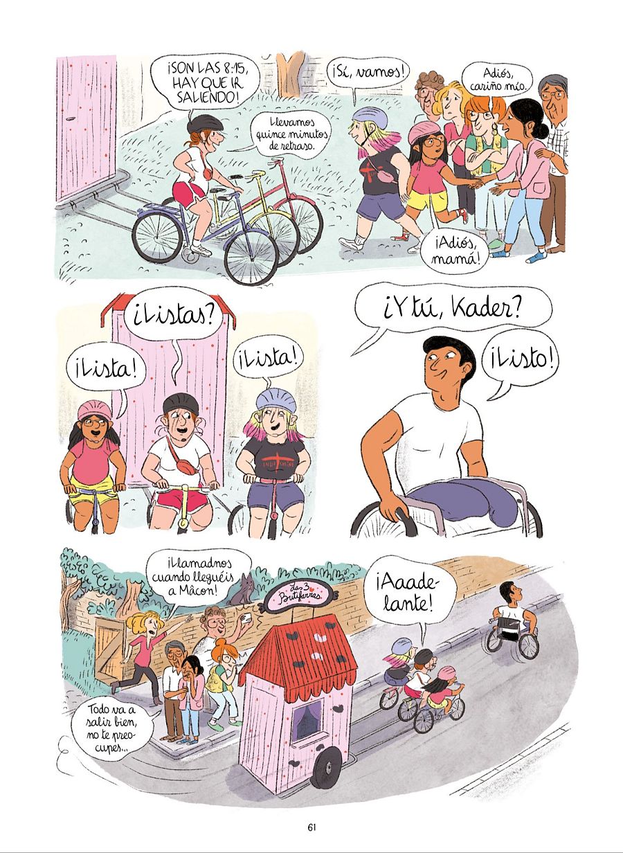 "Así que, lo que he intentado aportar es una puesta en escena diferente -añade-. Qué mis imágenes aumenten el placer de la lectura. Que los lectores disfruten viendo los rasgos y las reacciones de Mireille, Astrid y Hakima. Por eso es una adaptación grafica muy visual y diferente, que aporta cosas que el libro no cuenta. Obviamente, también hago recortes porque hay cosas que son muy literarias que no puedo resumir con los dibujos. Así que, ¿Qué puedo recortar que no sea imprescindible en el libro y que no necesariamente tenga que traducirse en imágenes? Estas son las preguntas que me planteo cuando hago una adaptación. Lo que hay que destacar gráficamente y lo que no hace falta..."